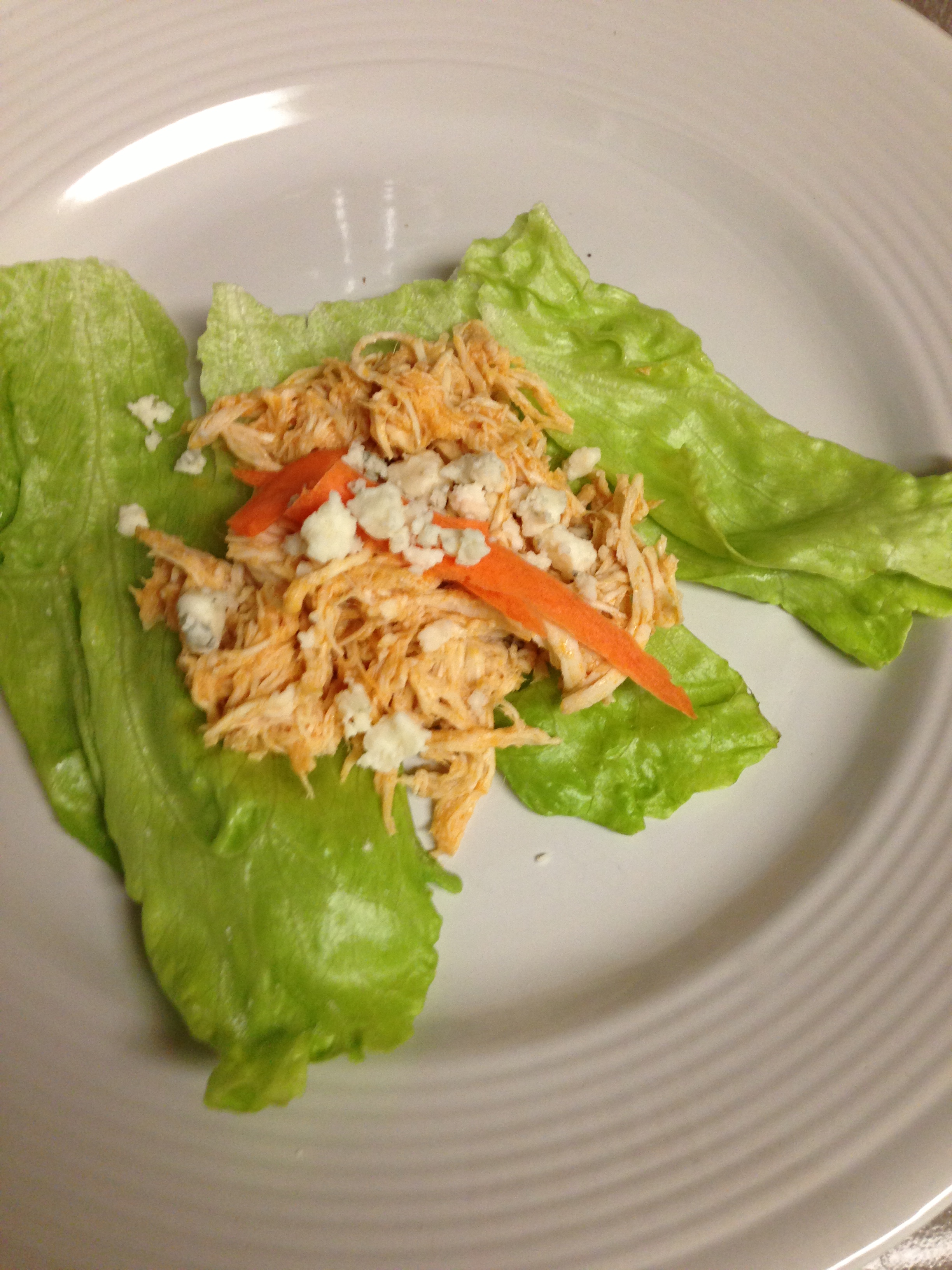 To prepare lettuce cups, place 1/2 cup buffalo chicken in each leaf, top with 1/4 cup shredded carrots, celery and dressing of your choice. Wrap up and start eating!