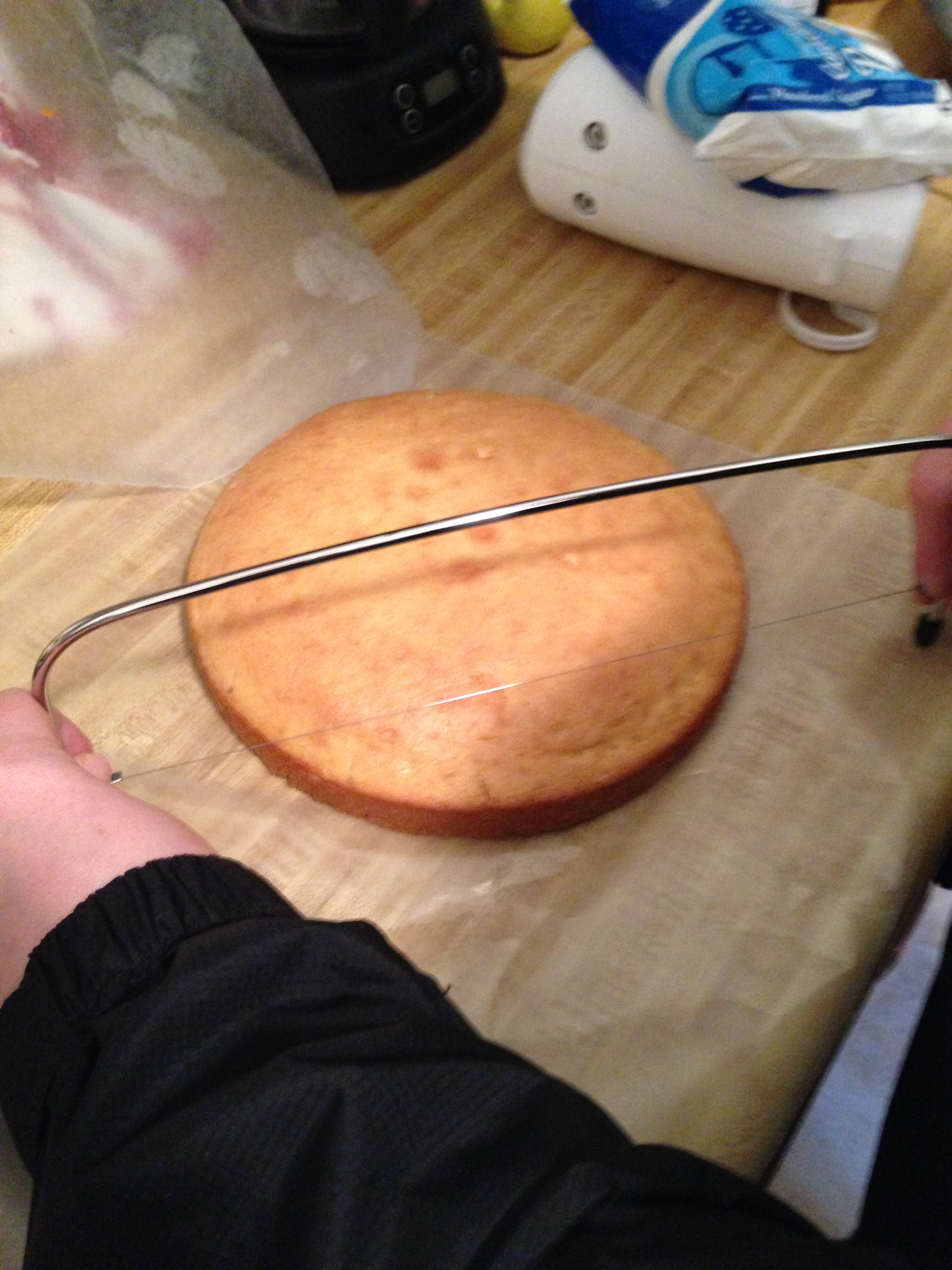 And then you cut the cake. Wait, what? Yes. Cut the cake. Before you frost it. It’s to make the top of the cake flat so that the second layer doesn’t slide off the first layer… Genius. And luckily, my genius roommate was at home to teach me how to use the handy tool that came with the frosting kit!
